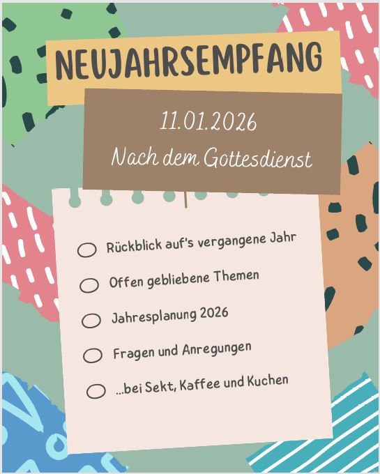 Das Presbyterium berichtet über aktuelle Themen wie Gottesdienste, Finanzen, Projekte und das Gemeindeleben. Zugleich haben die Gemeindeglieder die Möglichkeit, Fragen zu stellen, Anregungen einzubringen und sich aktiv an der Gestaltung unserer Kirche zu beteiligen.